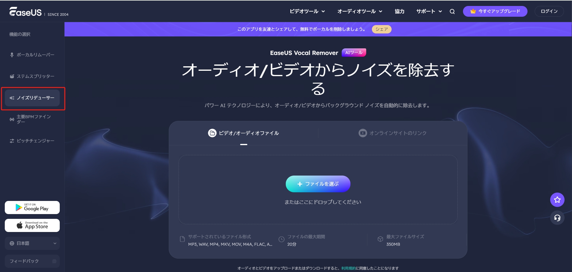 がレンジバンドでボーカルを除去するのが難しい場合は、EaseUS Online Vocal Removerをお試しください。このAI搭載のオンラインボーカルリムーバーツールは、ディープラーニング技術を活用して、ボーカルやノイズ、BGMを効果的に除去します。また、YouTubeの動画、Spotifyの楽曲、TikTokの動画からも音楽を削除することが可能です。