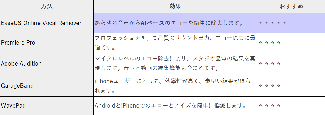 Audacity、Adobe Audition、EaseUS Online Vocal Removerなどのボーカルリムーバーソフトやサイト、GarageBandなどのMacに内蔵されているツールでオーディオや動画からボーカルを抽出・除去することが可能です。